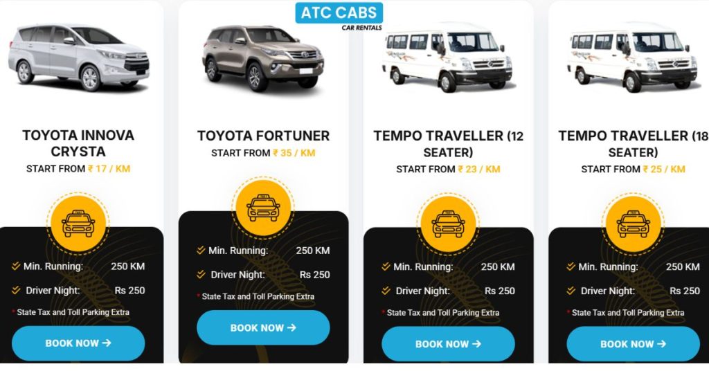 | Half Day | 8 hrs/80 km | Rs. 1,450 | Rs. 1,550 | Rs. 2,250 | Tolls extra, waiting |
