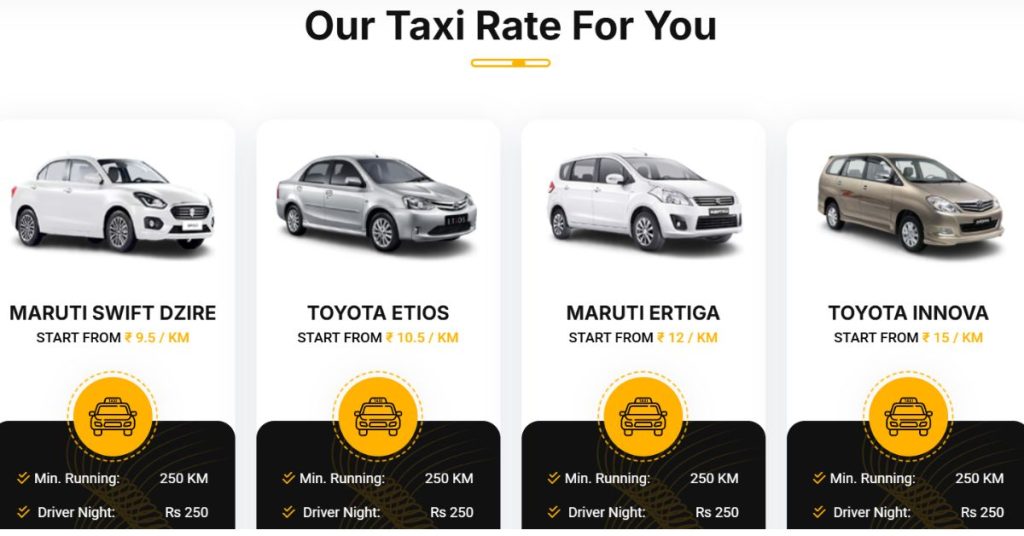 | Short Local | 4 hrs/40 km | Rs. 950 | Rs. 1,050 | Rs. 1,650 | Fuel, driver bata |