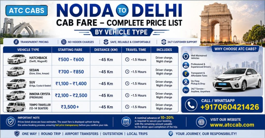 Every journey from Noida to Delhi deserves to start right. Whether it’s a business meeting, an airport run, a family outing, or a spontaneous day trip to explore Delhi’s iconic landmarks, ATC Cab is the partner you can trust. With unbeatable fares starting at ₹700, a fleet that ranges from budget hatchbacks to premium SUVs, drivers who know every shortcut on the NH-9 and DND Flyway, and a booking system that takes less than 2 minutes — ATC Cab redefines what a cab service experience should feel like.